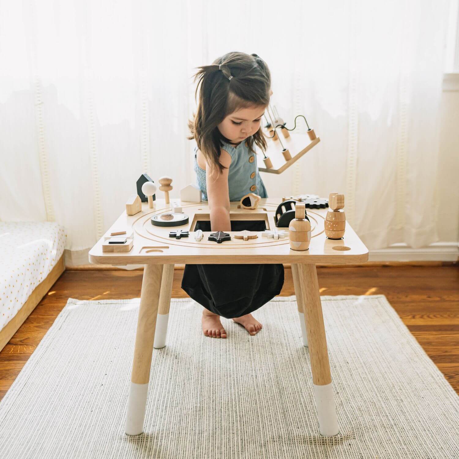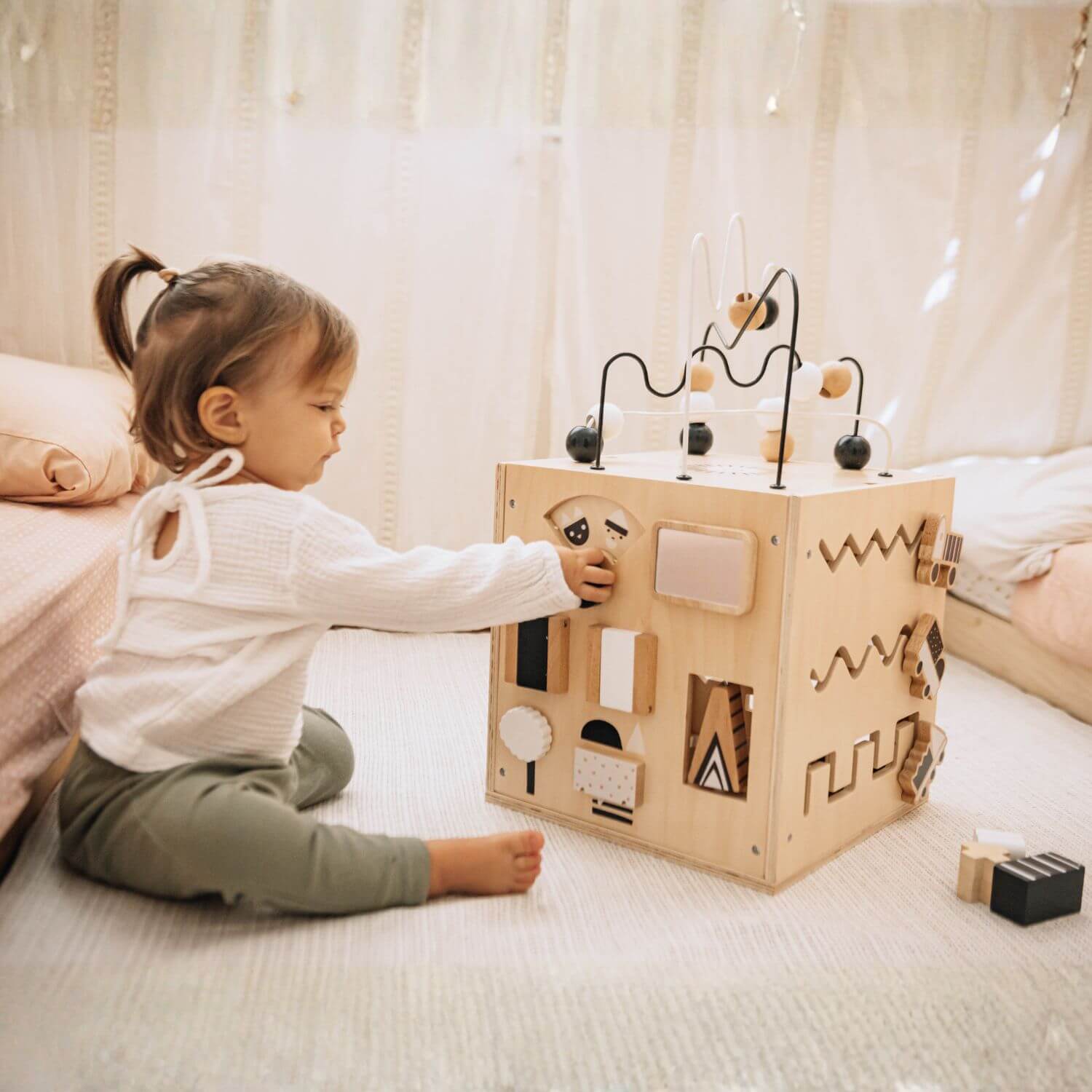 A versatile play center that sparks curiosity and hands-on learning. From stackable animals and a shape sorter to a clever lift-out maze with a cotton storage bag, every detail is crafted in premium wood with non-toxic finishes for safe, thoughtful play.