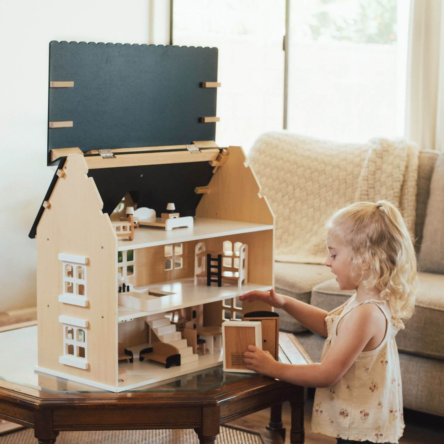 A beautifully crafted reversible dollhouse that invites storytelling and creativity. Featuring multiple floors, staircases, and a removable roof, it scales perfectly with Wonder and Wise furniture for endless customization and imaginative adventures.